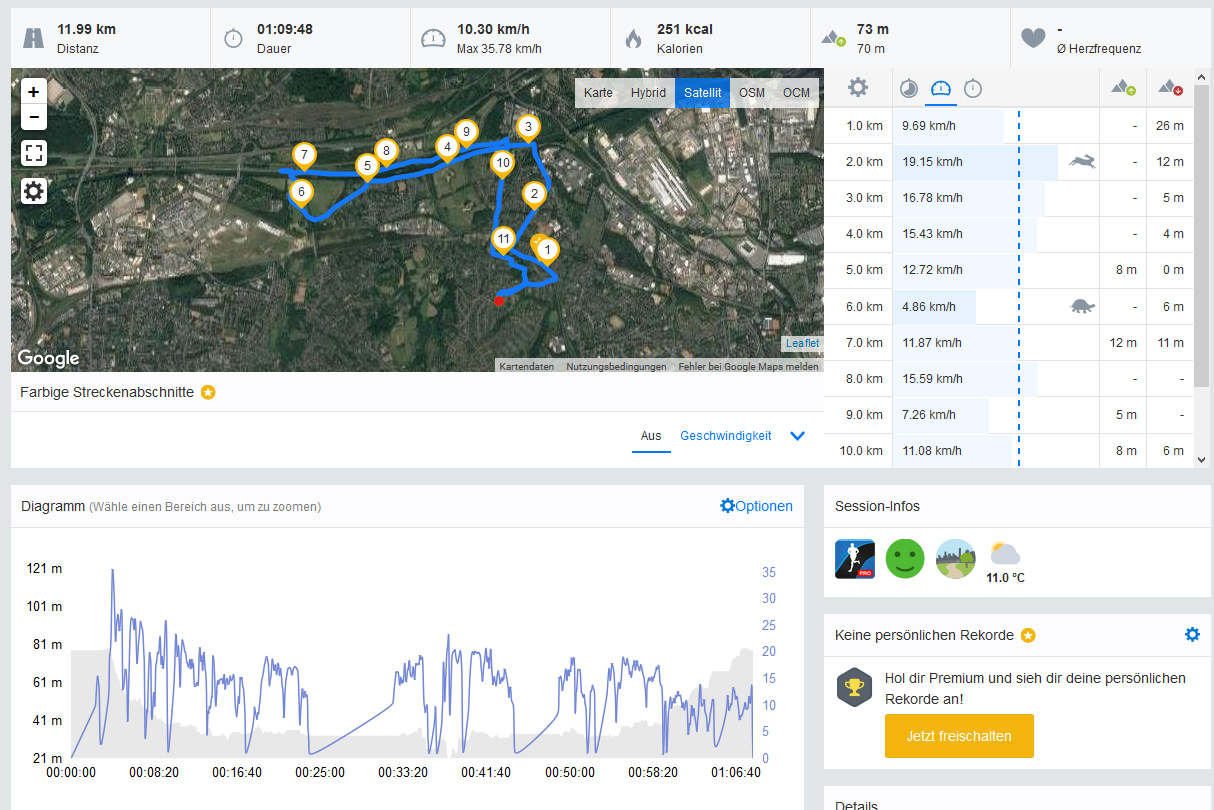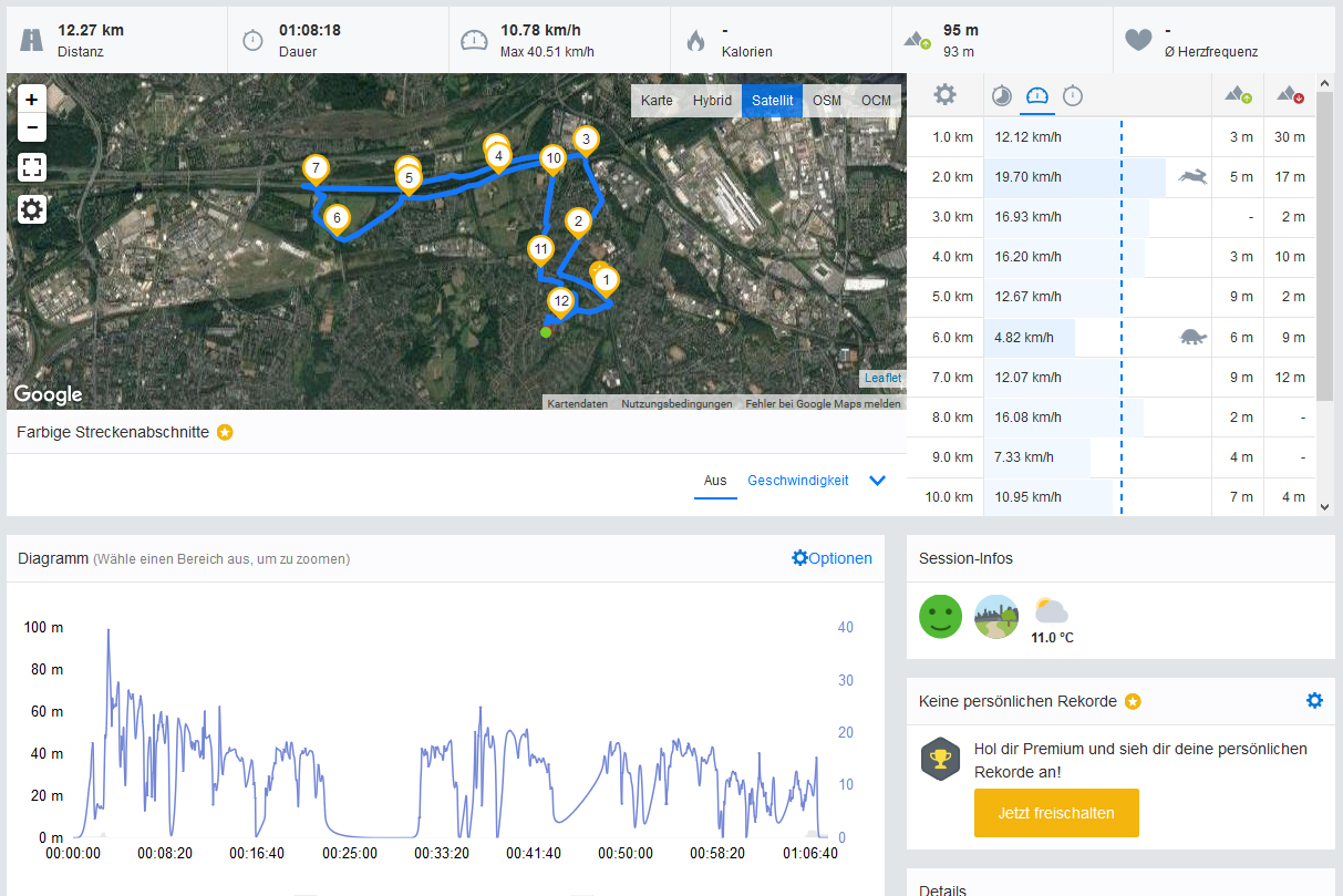 Darüber hinaus wurde das AGM A8 von unserer Redaktion auf einer gut 12 km langen Probefahrt getestet und musste sich dabei gegenüber dem Fahrrad-Navigationssystem Garmin Edge 500 behaupten. Dadurch, dass das AGM A8 Kurven etwas schneidet und die Route auf breiten Straßen gern vom Fahrradweg auf die Autofahrspur verlegt wird, weist es unter Google Maps eine 280 m kürzere Strecke aus.