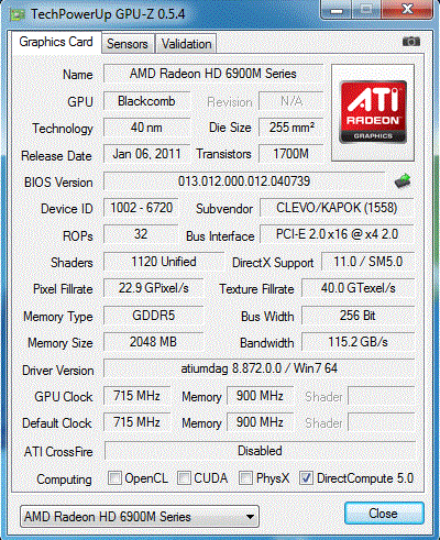 Doch genug mit dem Gehäuse, es handelt sich hier ja schließlich um einen GPU-Test. Von den Spezifikationen gleicht die Radeon HD 6990M teilweise ihrem Vorgänger HD 6970M. Beide Grafikkarten basieren auf den Desktop Barts Chip mit 1700 Millionen Transistoren und bieten einen 2048 MByte großen und 900 MHz schnellen GDDR5-Videospeicher (Bandbreite: 115.2 GB/s). Die Speicheranbindung bleibt ebenfalls identisch, 256 Bit reichen dank GDDR5 momentan locker. Hergestellt werden die GPUs im 40 nm Verfahren.