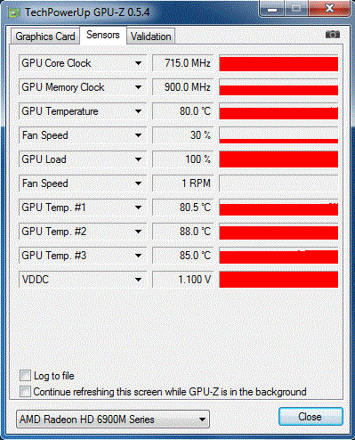 Eine Übertaktung war bei unserem Testgerät übrigens ein Leichtes, dem Overdrive-Menü (siehe Screenshot) sei Dank. Apropos Takt: Im Idle-Betrieb lief die Radeon HD 6990M mit relativ hohen 250 MHz (Kern) respektive 900 MHz (Speicher) - das geht noch besser. Unter Volllast (Furmark & Prime) wurden die normalen 715/900 MHz konstant gehalten.