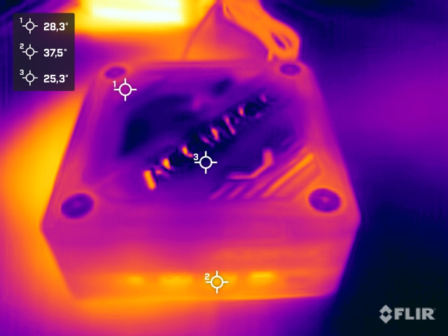 (+) Ohne Last messen wir eine durchschnittliche Temperatur von 28.4 °C auf der Oberseite. Der Klassendurchschnitt erreicht 32.5 °C.