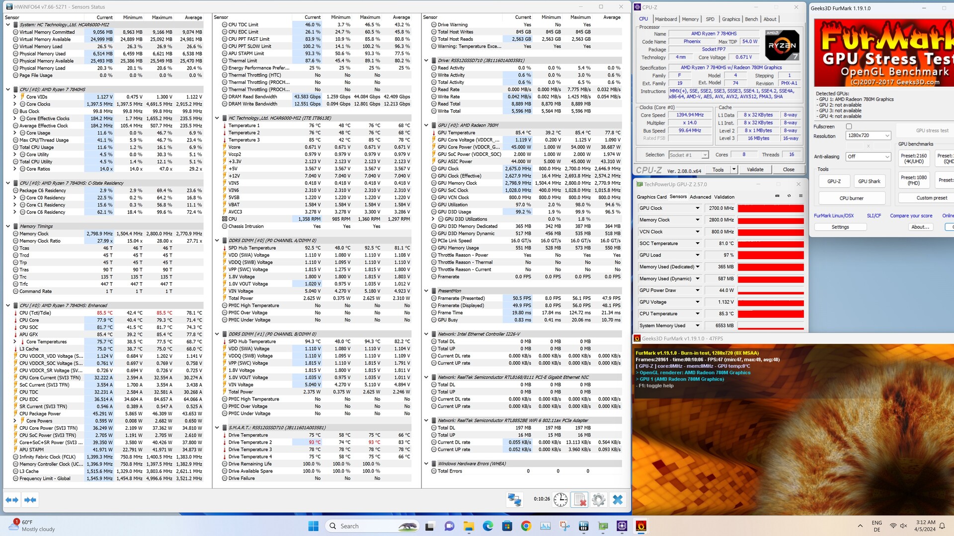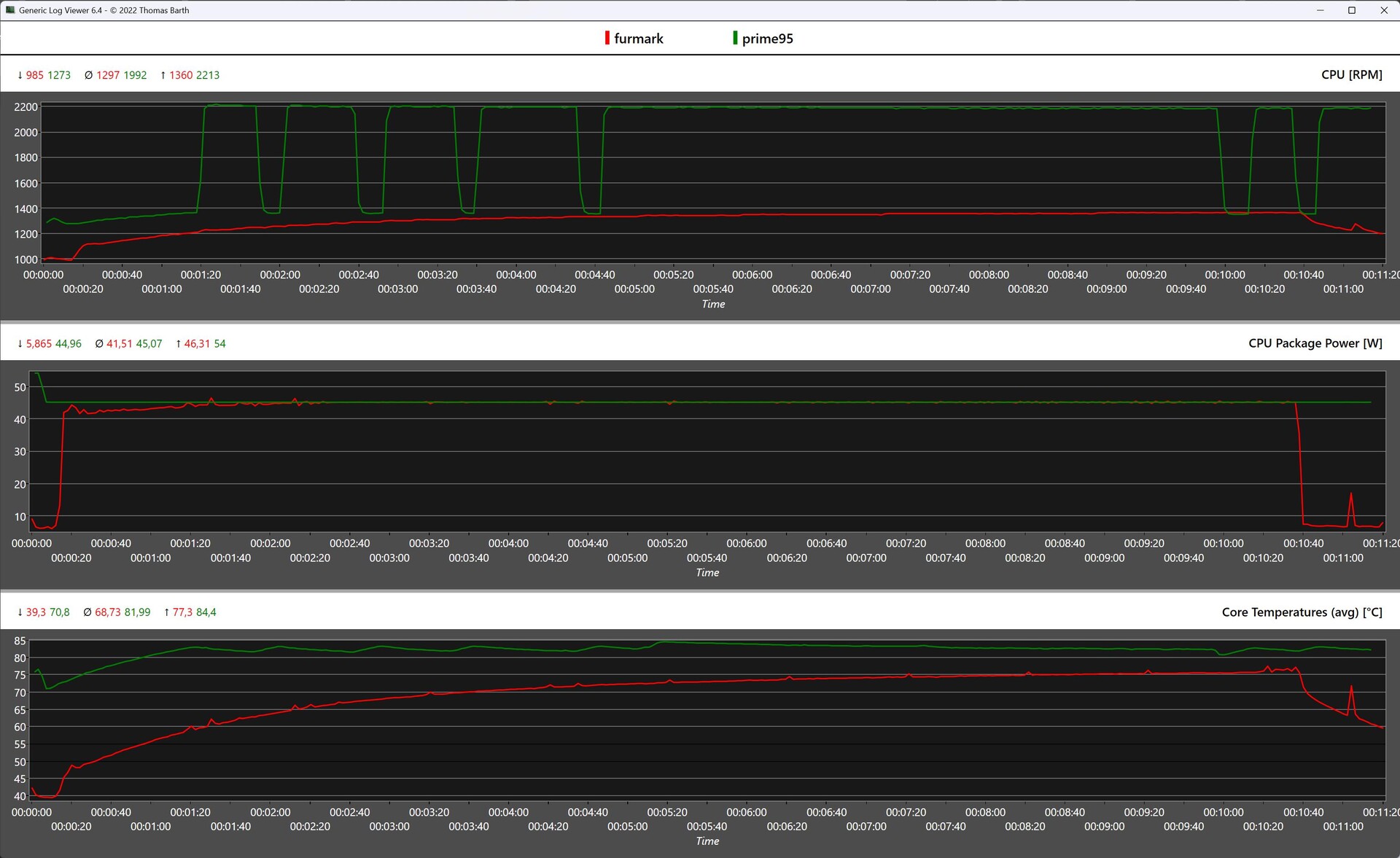Die Cinebench-R15-Dauerschleife simuliert eine immer wiederkehrende Dauerlast und gibt uns an dieser Stelle einen ersten Hinweis auf die Leistungsfähigkeit der verbauten Kühleinheit. Wie man anhand der Daten sehen kann, wird die Leistungsaufnahme strikt bei 54 Watt begrenzt, wenngleich im Durchschnitt knapp 42 Watt erreicht werden. Mit 85,5 °C erreicht der AMD Ryzen 7 7840HS keinen kritischen Temperaturbereich. Während des Verlaufs dokumentieren wir nur zu Beginn einen sehr geringen Leistungsverlust.
