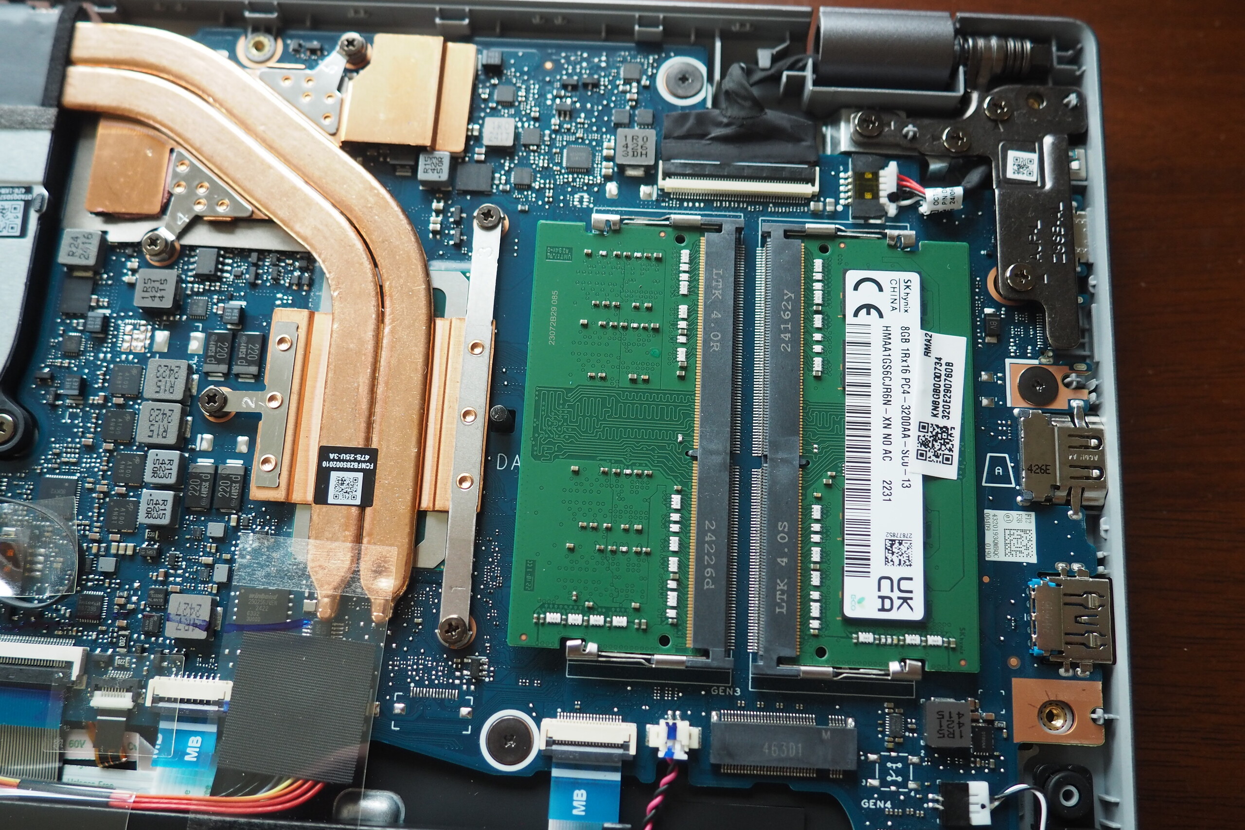 Nachdem man 11 Kreuzschrauben entfernt hat, lässt sich der Gehäuseboden aus der Verankerung hebeln und das Innenleben erreichen. Zwei RAM-Bänke und zwei M.2-2280-Slots verdienen in Zeiten von immer mehr verlöteten Komponenten Lob. Das Funkmodul und der Akku ließen sich bei Bedarf ebenfalls austauschen.