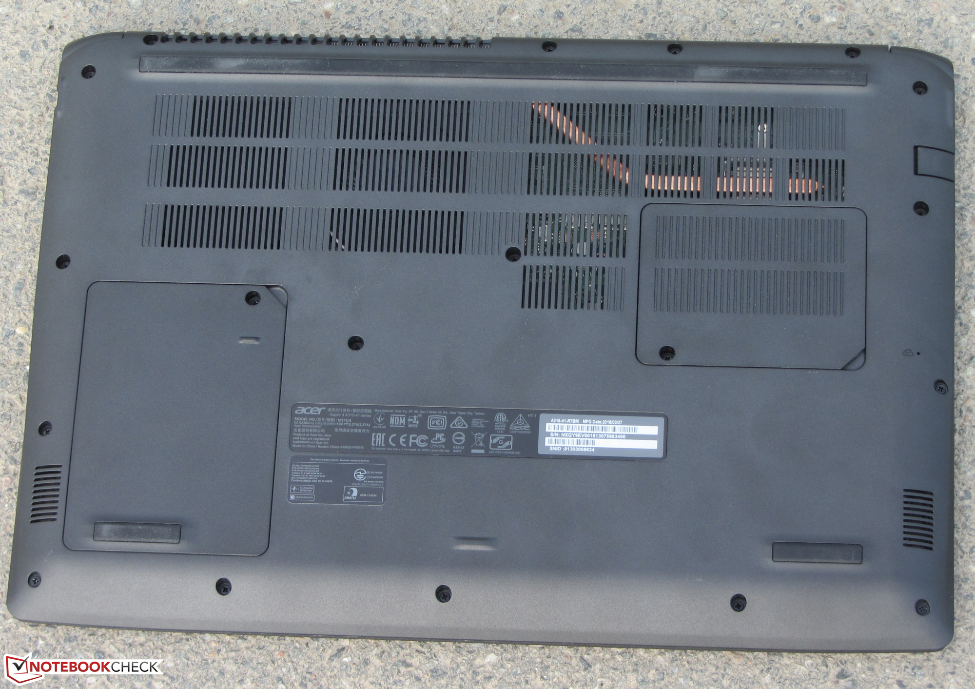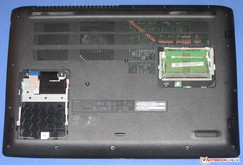 Das Aspire hat zwei Wartungsklappen zu bieten. Die kleine Klappe ermöglicht den Zugriff auf die Arbeitsspeicherbänke. Hinter der großen Wartungsklappe verbirgt sich ein Fach für eine 2,5-Zoll-Festplatte. Unserem Testgerät liegen weder der für den Einbau einer entsprechenden Festplatte nötige Einbaurahmen noch der SATA-Anschluss bei.