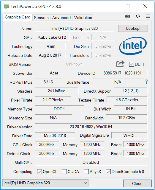 Um die Grafikausgabe kümmert sich Intels UHD Graphics 620 Grafikkern. Die GPU unterstützt DirectX 12 und arbeitet mit Geschwindigkeiten zwischen 300 und 1.000 MHz. Die Resultate in den 3DMark Benchmarks bewegen sich auf einem normalen Niveau für den hier verbauten Grafikkern. Eine Steigerung der Leistung wäre durch den Einbau eines Speichermoduls (= Dual-Channel-Modus aktiv) zu erreichen.