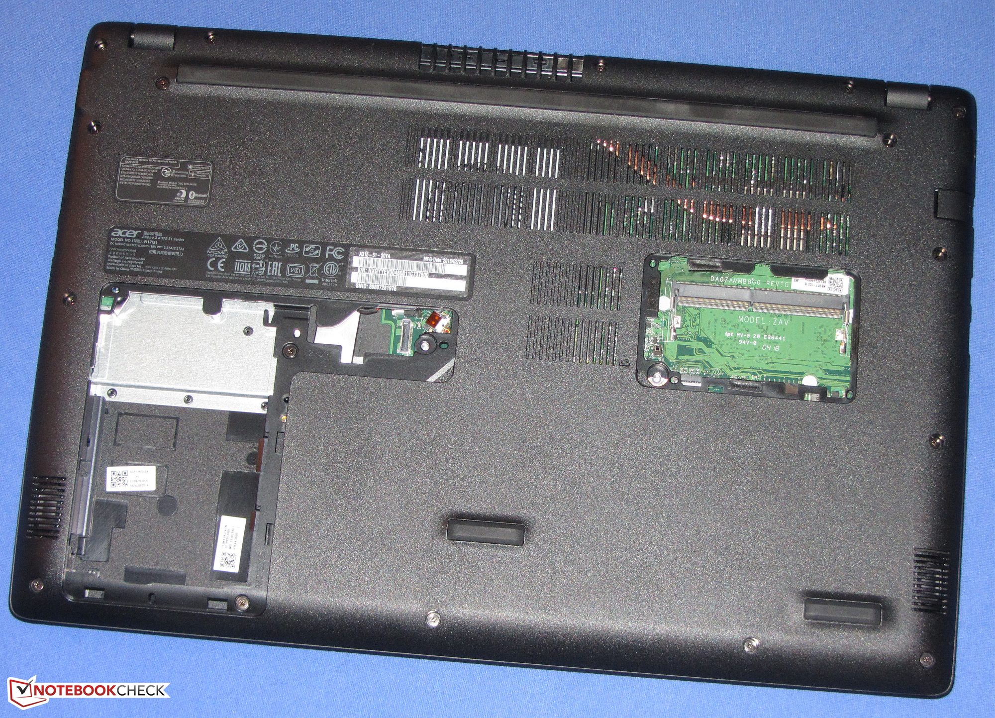 Hinter der großen Wartungsklappe des Aspire verbirgt sich ein Fach, das für eine 2,5-Zoll-Festplatte vorgesehen ist. Unserem Testgerät liegen weder der für den Einbau einer entsprechenden Festplatte nötige Einbaurahmen noch der SATA-Anschluss bei. Bei Bedarf müssten die entsprechenden Komponenten separat besorgt werden. Wir konnten ein Einbaukit bestehend aus Rahmen und SATA-Kabel bei einem Acer Ersatzteilpartner (https://www.sb-electronics.de) für knapp 43 Euro ausfindig machen.