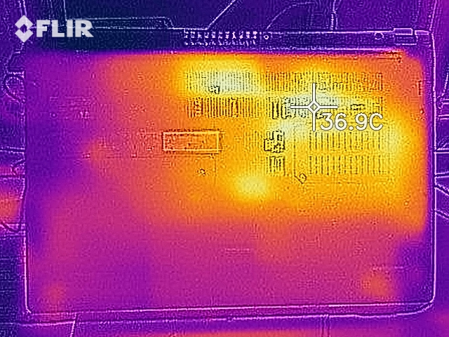 (+) Auf der Unterseite messen wir eine maximalen Wert von 33.4 °C (im Vergleich zum Durchschnitt von 36.8 °C).