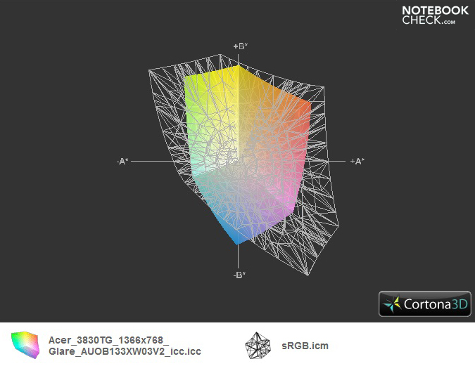 Der gebotene Kontrast von 162:1 und der erhöhte Schwarzwert von 1,15 cd/m² sind bekannte Schwachstellen von günstigen TN-Panels. Ein hoher Kontrast ist vor allem bei der Wiedergabe von Filmen oder Fotos wünschenswert, ein niedriger Schwarzwert würde dabei eine satte Schwarzdarstellung ermöglichen. Im Fall des TimelineX wirkt schwarz mit freiem Auge leicht angegraut. Auch wenn dieses Subnotebook weniger den professionellen Nutzer ansprechen wird, wollen wir nicht auf den Vergleich des darstellbaren Farbraums verzichten. Der häufig gebrauchte sRGB-Farbraum wird dabei nicht annähernd abgedeckt und auch hier bewegt sich das Panel nur im bereich günstiger Consumer Laptop-Bildschirme.