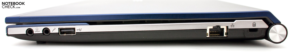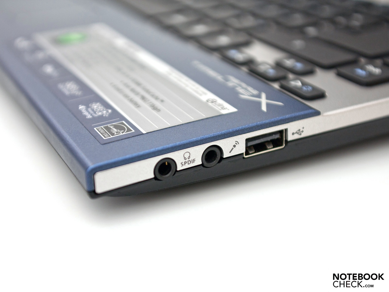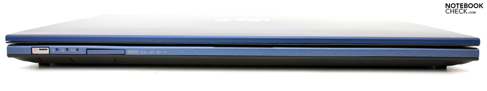 Die Gehäuseseiten des 3830TG halten einen guten Schnittstellenumfang für den Nutzer bereit. Neben den üblichen Verdächtigen, wie beispielsweise USB 2.0, VGA, der Netzwerkbuchse und den Audioanschlüssen, sind auch HDMI (mit 1.4a Unterstützung) sowie ein schneller USB-3.0-Port untergebracht. Dieser versorgt Peripherie auch im ausgeschalteten Zustand mit Strom. Die Aufteilung ist im Vergleich zum größeren 4830TG ähnlich, aber teilweise seitenverkehrt. Ein optisches Laufwerk ist nicht an Bord, gehört aber auch nicht zum Pflichtprogramm. Die Positionierung der einzelnen Ports ist relativ frontlastig und das Arbeiten mit einer externen Maus könnte, muss aber nicht problematisch werden. Die Vorder- und Rückseite hat Acer, bis auf den Kartenleser, nicht genutzt oder wegen des Akkus nicht nutzen können.