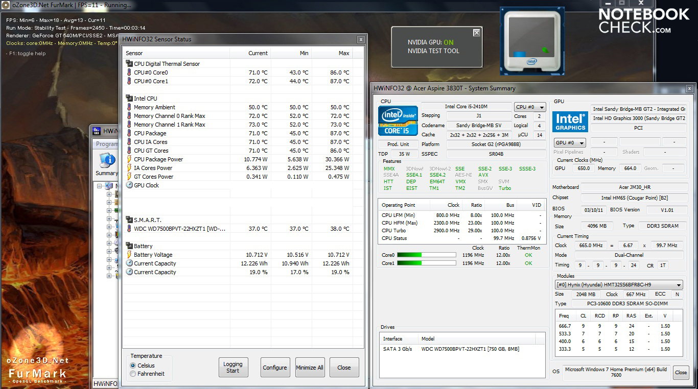 Bevor es an die Leistungbewertung in den verschiedenen Benchmarks geht: Wie auch die größeren Geräte Acer Aspire TimelineX 4830TG und 5830TG drosselt die CPU im Gaming-Betrieb schon nach relativ kurzer Zeit auf die bekannten 1196 MHz. Die ersten durchgeführten Benchmarks blieben aber hinsichtlich ihres Ergebnis im erwarteten Rahmen für diese Konfiguration.