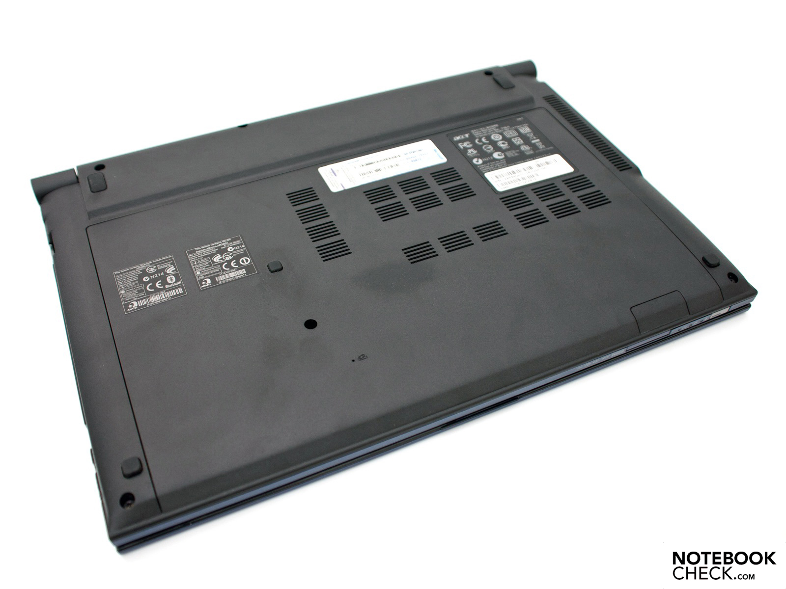 Die Unterseite aus mattschwarzen Parts wird durch Lüftungsöffnungen und eine riesige Wartungsabdeckung dominiert, die mit nur einer Schraube fixiert und damit schnell entfernt ist. Darunter finden sich zwei RAM-Bänke für maximal 8 GByte DDR3-Arbeitsspeicher, das 2,5-Zoll-Speichermedium, ein Teil des Kühlsystems sowie der freie Platz für ein UMTS-Modul und der SIM-Einschub.
