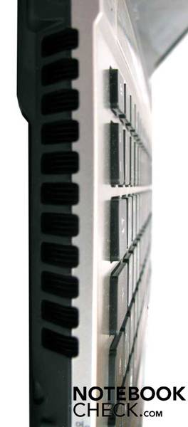 Die Verlustleistung der CPU und GPU wird durch das neue Lüfterkonzept, das beim Acer Aspire 4830TG zum Einsatz kommt, schnell und effektiv nach außen abgeführt. Hierzu befindet sich linkerhand eine große Lüftungsöffnung. Hier bläst der Lüfter die erwärmte Luft nach außen. Wie schon oben beschrieben mit bis zu 40,6 dB(A). Unter Last wird die ausströmende Luft deutlich wärmer, als nur beim Surfen oder Texte schreiben. Unter Last stiegen die Temperaturen an der Geräteunterseite an, und könnten bei der Benutzung des Notebooks auf den Oberschenkeln schon unangenehm werden.