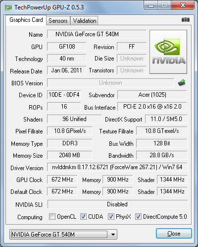 Neben der integrierten Intel-Grafikkarte besitzt das Aspire 4830TG auch eine dedizierte Grafikkarte aus dem Hause nVidia. Die GPU der Grafikkarte nVidia GeForce GT 540M basiert auf den GF108 Kern. Die nVidia-Grafikkarte kann auf 2 GByte DDR3-Speicher zugreifen, der mit 900 MHz arbeitet.