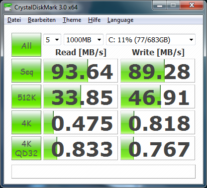 Eine Festplatte von Western Digital mit einer Speicherkapazität von 750 GByte dient dem Acer Aspire 4830TG als Massenspeicher. Die 2,5-Zoll-Festplatte der Serie Scorpio Blue vom Typ WD7500BPVT-22HXZT1 rotiert mit 5400 Umdrehungen pro Minute und zeigt dadurch nur durchschnittliche Leistung in den Testprogrammen. Die maximale Übertragung bewegt sich, je nach Test-Programm zwischen 86 und 94 MB/s, was nichts Besonderes ist. Länge Ladezeiten sind mit solch einer Festplatte vorprogrammiert.