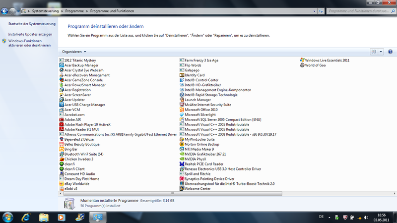 Was Acer bei beim Zubehör einspart, wird durch die viele vorinstallierte Software-Beigabe wieder "ausgeglichen". Auf der Festplatte vom Aspire 4830TG sind unter anderem Microsoft Office 2010 Starter und zahlreiche Freeware- und Testprogramme vorzufinden. Das hat jedoch auch seine Schattenseite: Der Bootvorgang dauert extrem lange und belastet das System. Die Empfehlung von uns ist, dass man alle nicht benötigten Programme deinstallieren sollte. Die Programme sind nach einem Recovery, das heißt einer Zurücksetzung in den Auslieferzustand, jedoch alle wieder vorhanden.