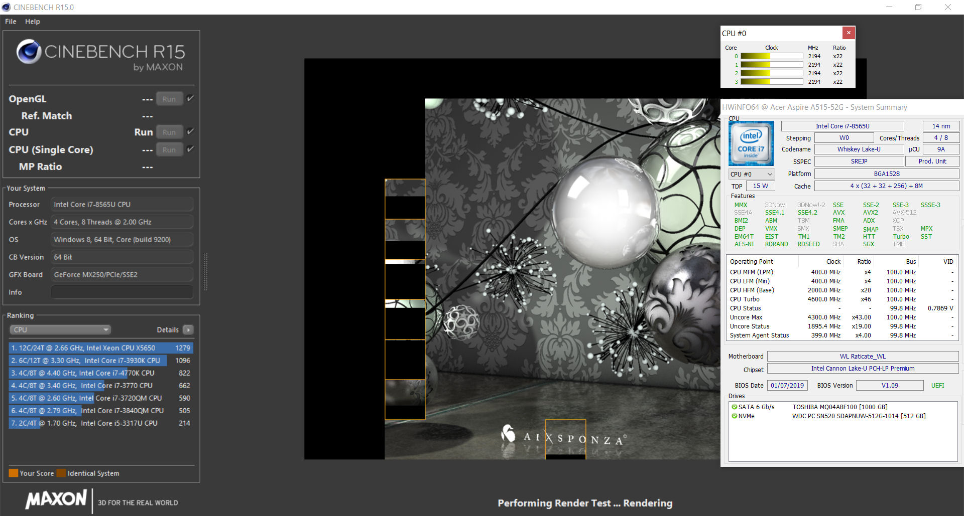 Obwohl sich die Taktraten deutlich unterscheiden, fallen die Ergebnisse recht ähnlich aus. So liegen die CB15-Resultate im Akkubetrieb bei 162 Punkten (Single-Thread) bzw. 470 Punkten (Multi-Thread).