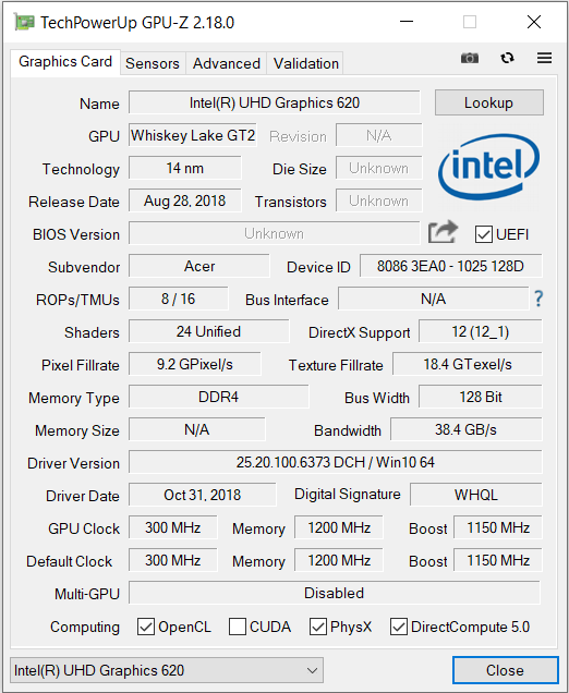 Das Aspire wird von einem Core i7-8565U Vierkernprozessor befeuert, der auf Intels aktueller Whiskey-Lake-Architektur basiert. Es handelt es sich um ein ULV-Modell, das über eine TDP von 15 Watt verfügt. Acer genehmigt eine kurzzeitige Erhöhung auf 51 Watt. Der Core i7 arbeitet mit einer Basisgeschwindigkeit von 1,8 GHz. Mittels Turbo ist eine Steigerung auf 4,1 GHz (alle vier Kerne), 4,5 GHz (zwei Kerne) bzw. 4,6 GHz (ein Kern) möglich.