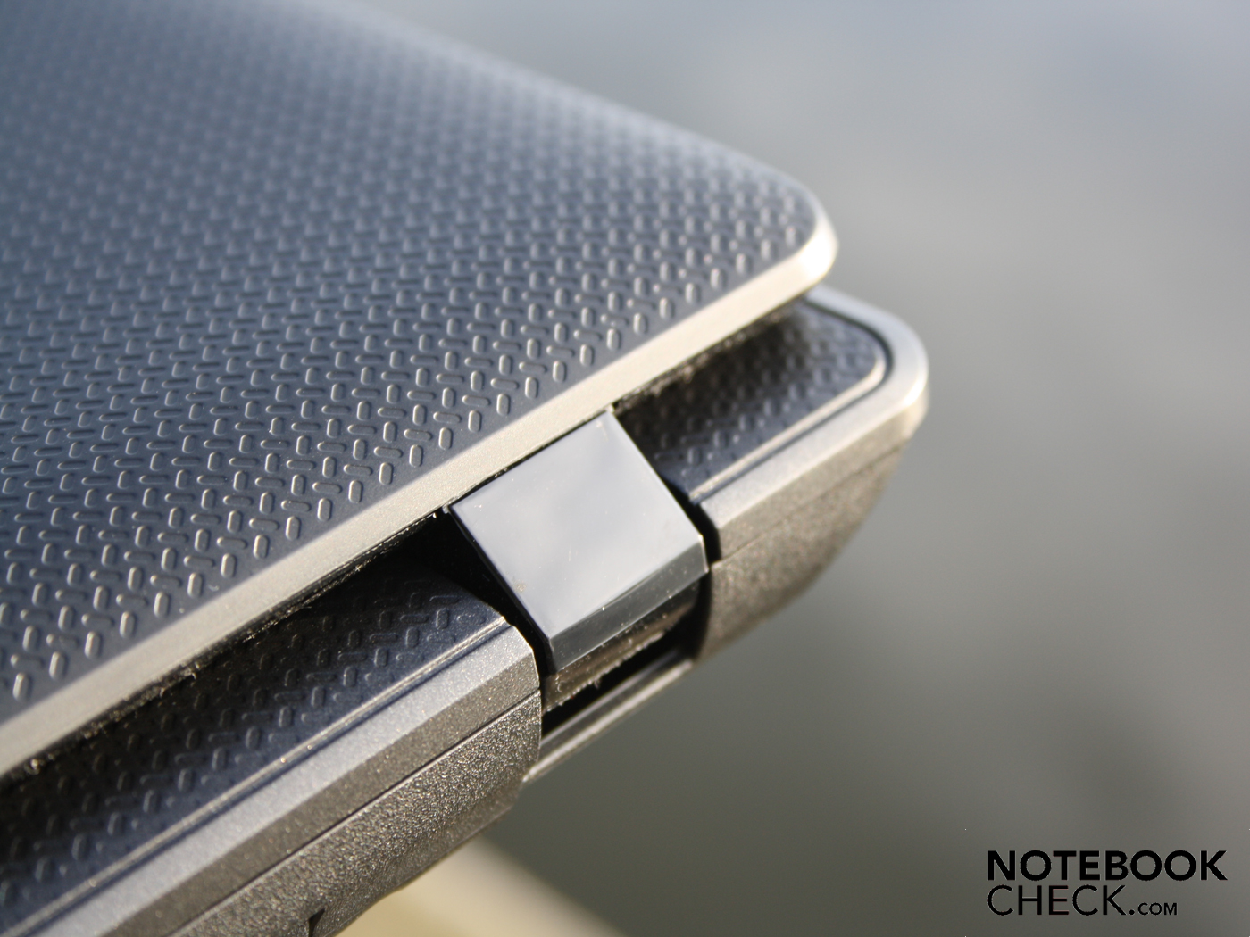 Die Gelenke halten den Deckel sicher in Position, es gibt kaum ein Nachwippen. Sie sind stramm festgezurrt, weshalb wir zwei Hände zum Öffnen benötigen. Die Scharniere selbst sitzen sicher in ihrer Arretierung am Chassis. Der maximale Klappwinkel ist für den Betrieb auf dem Schoß vollkommen ausreichend. Der Winkel beträgt weite 160 Grad.