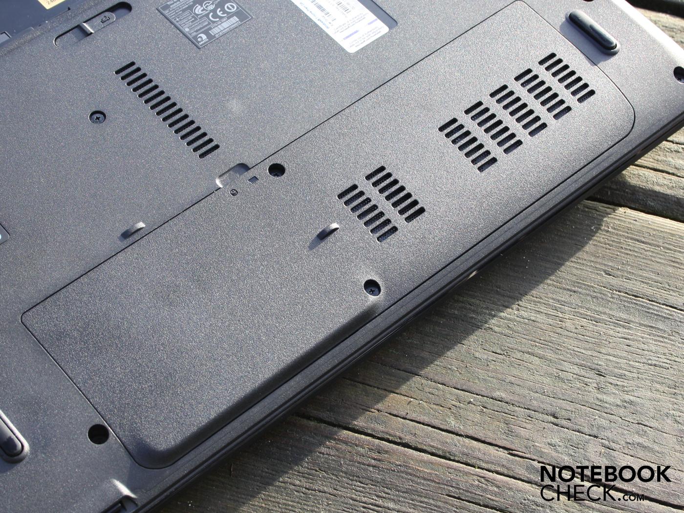 Das Gehäuse ist ausreichend stabil und vermittelt durch saubere Spaltmaße einen langlebigen Eindruck. Mit beiden Händen können wir das Chassis nur begrenzt verwinden. Die Handballenauflage kann rechts geringfügig eingedrückt werden. Das Tastenbett gibt jedoch schon auf leichten Druck hin deutlich nach. Die Bodenplatte lässt sich punktuell mit dem Finger eindellen, speziell an den Luftgittern. Die große Öffnung an der Unterseite bietet Aufrüst-Optionen: Es besteht Zugang zu Festplatte, Arbeitsspeicher und WLAN-Modul (mini PCIe).