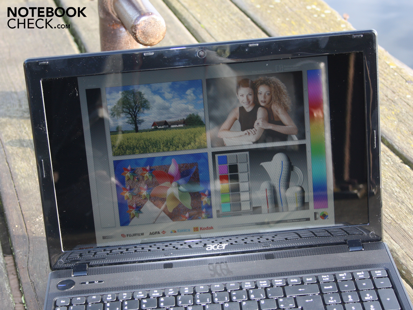 Die Anzeige des 5552G ist für den Außengebrauch nicht geeignet. Die sehr knappe Luminanz reicht zwar fürs Büro vollkommen aus, versagt aber in der Sonne. Der Desktop bleibt dann einfach zu duster. Hinzu kommen störende Reflexionen auf Grund des Glare-Type-TFTs.
