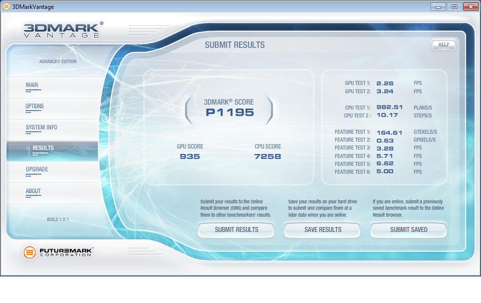 | 3DMark Vantage P Result | 1195 Punkte | |