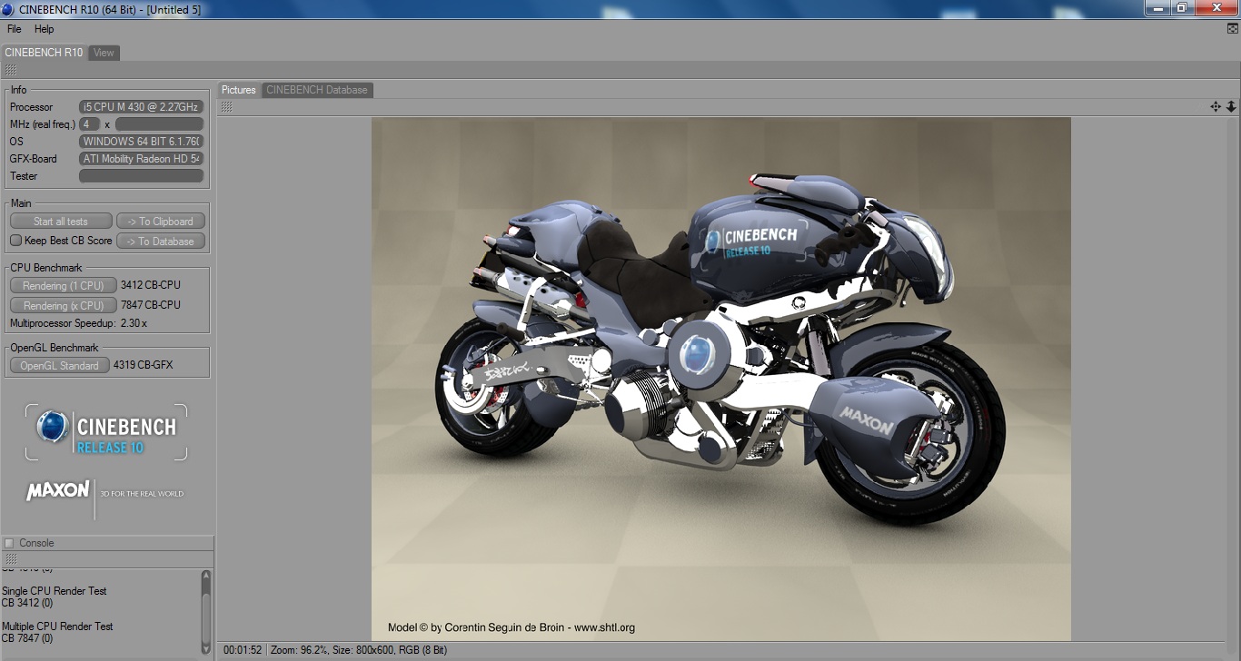 Zum Testparcour gehört natürlich auch das altbewährte Cinebench R10. Die erzielten Ergebnisse beim Single Core Rendering waren 3412 Punkte. Beim Multi Core Durchlauf gab es dann schon 7847 Punkte. Für das Shading vergab Cinebench R10 4319 Punkte.