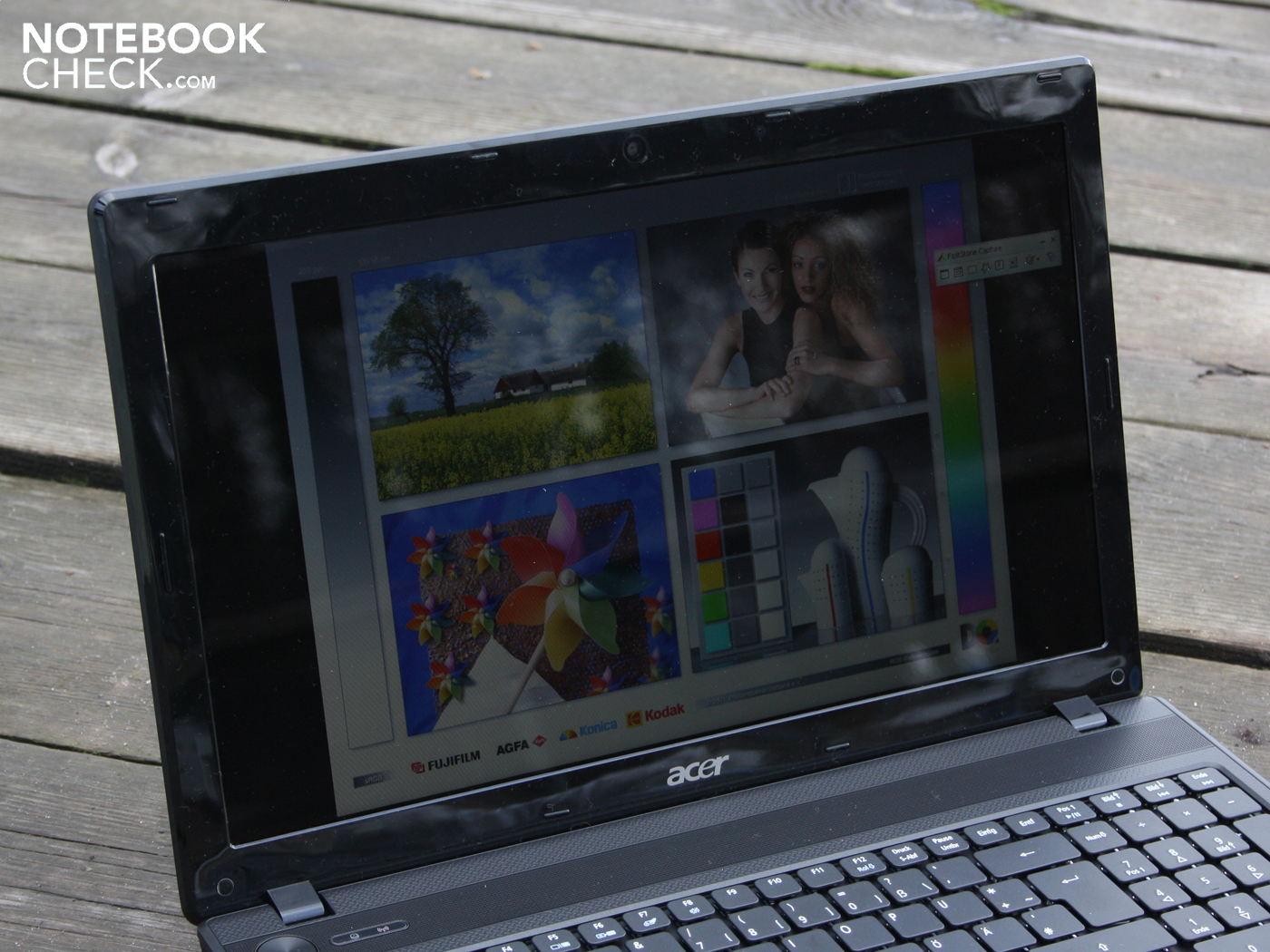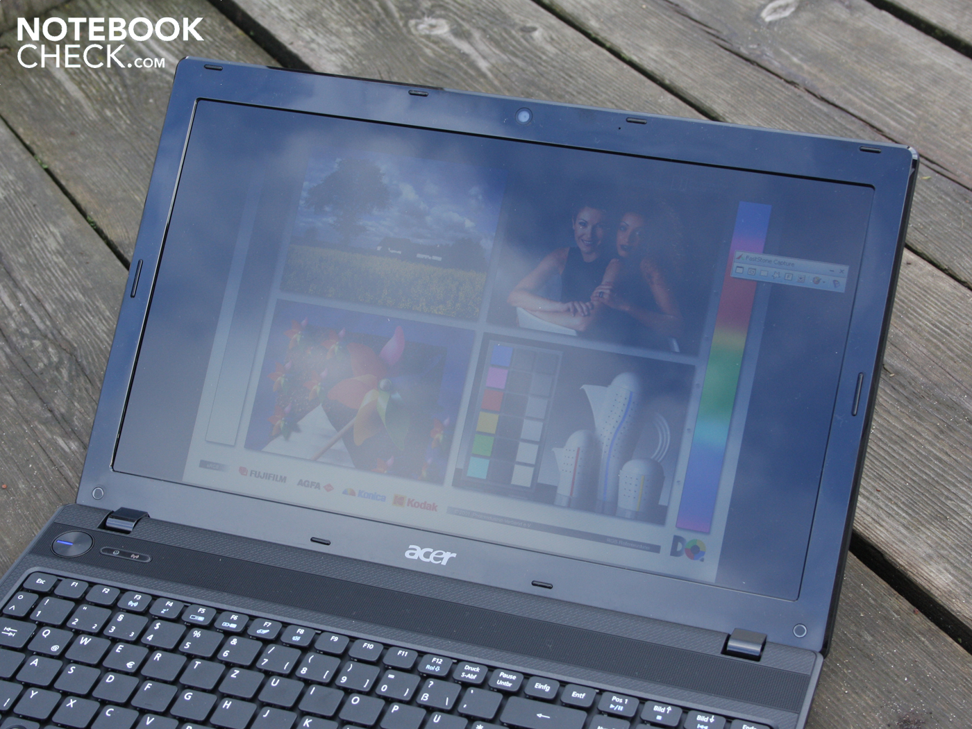 Die Anzeige des 5742G ist für den Außengebrauch ungeeignet. Schuld sind die deutlichen Reflexionen auf dem nicht entspiegelten Displaypanel. Hieran kann auch die recht gute Helligkeit nichts verändern, auch wenn sie dagegen ankämpft. Der Desktop verdunkelt sich unter Sonnenlicht nicht zwangsläufig, aber der Glare-Type behindert die Sicht stark.