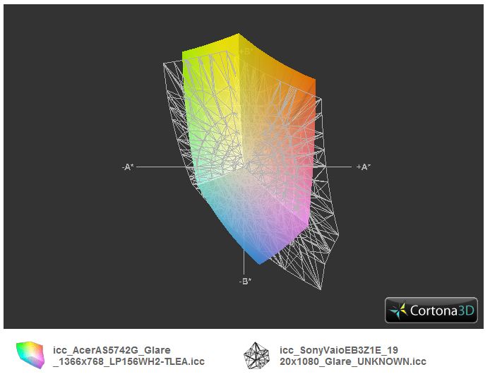 Für Profis ist das Panel schon wegen des kleinen Farbraumes inakzeptabel. Ein erweiterter Farbraum liegt in weiter Ferne. Wir stellen das Panel im Vergleich mit AdobeRGB (t), sRGB (t) und dem guten Consumer-Display des Sony Vaio EB3Z1E (t) dar.