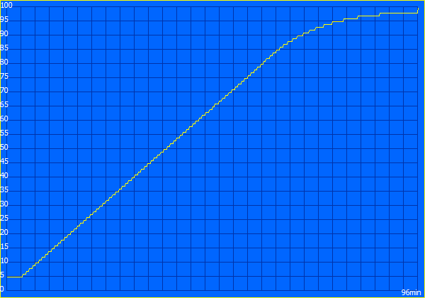 Der Test der Laufzeit eines DVD-Films ermittelte 160 Minuten (2:40 Stunden). Für die nächste Film-Session ist der 4.400 mAh Akku nach 1:41 Stunden wieder bereit (96 Minuten, Ladung).