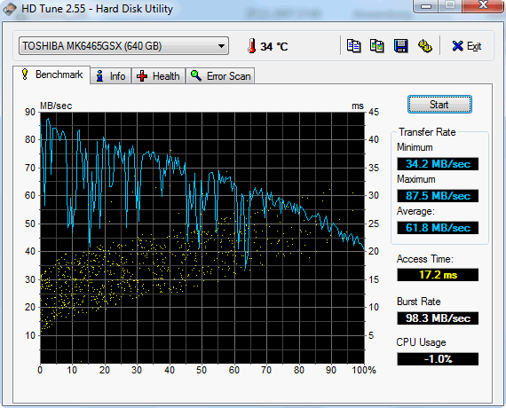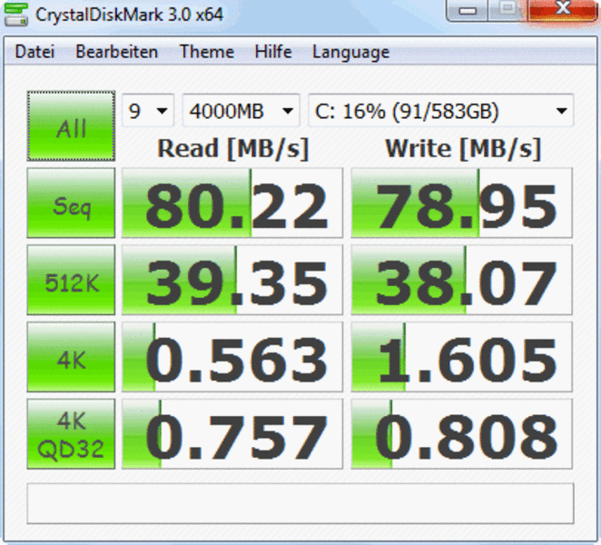 Im 5742G ist eine 5.400 RPM Festplatte von Toshiba verbaut (MK6465GSX). Die 640 GByte HDD liest mit 61.8 MByte/s im Sequential Read Daten von den rotierenden Scheiben. Der Crystal Disk Mark weist auf Grund einer anderen Testroutine 80 MByte/s aus. Dieser relativ geringe Wert bringt dem Testgerät nur dennoch einen guten HDD-Score im PCMark Vantage (3.701 Punkte). Ursache hierfür könnte die hohe Burst Rate von 98.3 MB/s sein. Diese Datenrate gibt an, mit welcher Geschwindigkeit Daten aus dem Cache des HDD ausgelesen werden können.
