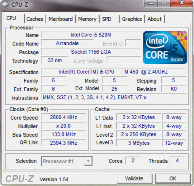 Das Acer Aspire 5742G gibt es, je nach Modell, sowohl mit einem Intel Core i3-370M Prozessor (2.4 GHz), mit einem Core i5-460M (2.53 GHz), als auch mit einem i5-450M, wie es bei unserem Testmodell der Fall ist. Dieser besitzt eine Standard-Taktung von 2.40 GHz. Mit dem Turbo-Boost-Feature taktet sich die CPU automatisch auf bis zu 2.66 GHz hoch, sollte mehr Leistung benötigt werden. Die zwei Kerne des Core i5-450M sind mit HT (Hyper Threading) in der Lage, insgesamt vier Threads parallel zu bearbeiten. Der im 32nm Verfahren hergestellte i5-450M Prozessor hat eine TDP von rund 35 Watt.