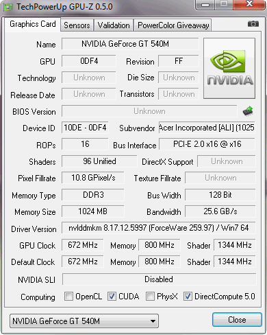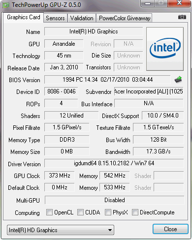 Die Speicherbandbreite liegt wie bei den Radeon HD 6550 Gegenstücken bei 128Bit. Dies könnte in hohen Auflösungen die Leistung limitieren, aber eine solche bietet das Aspire 5742G nativ ohnehin nicht. Der Kern taktet mit 672, der Speicher mit 800 MHz (Siehe Tools GPUZ-Z). Die Spezifikationen würde auch 900 MHz Speichertakt erlauben. Die GPU unterstützt Optimus und kann zu Gunsten der Intel HD (IGP) deaktiviert werden (Vollautomatisch). Anfängliche Probleme bei Computerspielen waren teilweise der Start des Spiels mit der Intel HD. Unser Testgerät verarbeitete die drei Testspiele aber anstandslos.