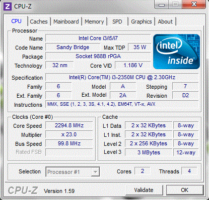 Mit Blick auf die Leistung der GeForce Grafikkarte reicht ein Zweikerner aus Intels Core-i3-Reihe locker. Der im 32-nm-Verfahren hergestellte i3-2350M enthält einen drei MByte großen L3-Cache und taktet mit maximal 2.3 GHz (kein Turbo). Wie die restlichen Dual-Core-Modelle kann die Midrange-CPU bis zu vier Threads parallel bearbeiten (die Hyper-Threading-Technologie simuliert zwei virtuelle Kerne).