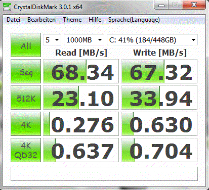 Als Festplatte hat Acer eine 500 GByte große HDD von Western Digital gewählt (5400 U/Min). Mit einer durchschnittlichen Übertragungsrate von 65 MB/Sek gehört die WD5000BPVT-22HXZT1 nicht gerade zu den schnellsten Vertretern. Die ermittelte Zugriffszeit (~21 ms) ist ebenfalls dürftig. Eine gute 7200er HDD oder ein Solid State Drive würden den Windows Alltag spürbar beschleunigen.