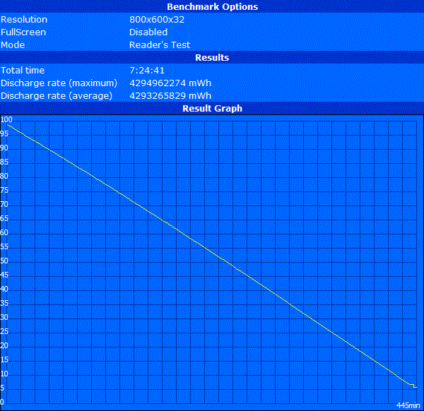 Dank der Grafikumschaltung und der sparsamen Hardware kann sich die Akkulaufzeit durchweg blicken lassen. Wenn das Notebook mit deaktivierter GeForce und minimaler Helligkeit vor sich hin träumt, wird der Lithium-Ionen-Akku (48 Wh, 4400 mAh) erst nach knapp 7.5 Stunden leer.