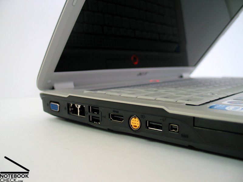 Auch bei der Anschlussausstattung geizt das Acer Aspire 5920G keinesfalls. Insgesamt findet man 4 USB Ports, VGA, S-Video und HDMI Port, Firewire, ExpressCard und die Audio Ports inklusive optischen Ausgang (S/PDIF) am Gerät. Eine erwähnenswerte Eigenheit des 5920G wäre diesbezüglich noch zu erwähnen: Der USB Port an der rechten Seite wurde so nahe am DVD Laufwerk platziert, sodass im Falle eines breiten USB Sticks oder Steckers sich die Laufwerkslade nicht mehr öffnen lässt...