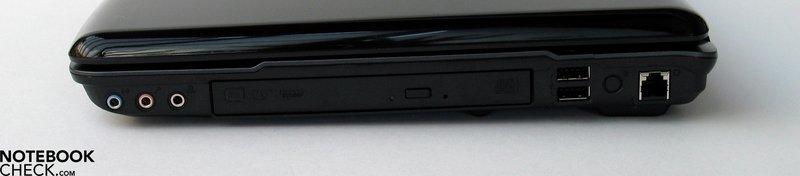 Auf der rechten Seite befinden sich die Audiostecker für Kopfhörer, Mikrofon und S/PDIF, gefolgt vom DVD-Laufwerk und zwei USB 2.0 Anschlüssen. Gleich daneben im hinteren Bereich findet sich der Modemanschluss wieder.