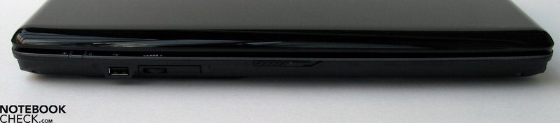 Auf der linken Seite finden sich Anschlüsse für Kensington Lock, Easy Port IV für eine Dockingstation um die Anschlussmöglichkeiten weiter auszubauen, LAN, VGA-out, HDMI, USB/eSATA (Kombi Anschluss), Express Card Slot 54 und ein 5in1 Card Reader (SD/MMC/MS/MS Pro/xD) wieder.
