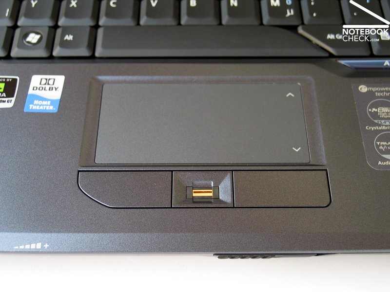 Das Touchpad besitzt eine leicht raue Oberfläche und wurde etwas tiefer ins Gehäuse eingelassen, wobei die Kanten um das Touchpad herum abgeschrägt wurden um einen fließenden Übergang von Touchpad und Handballenauflage zu gewährleisten. Gleich unter dem Touchpad befinden sich die zwei Maustasten, zwischen denen sich der vorhin schon erwähnte Fingerprint-Reader befindet. Sowohl Touchpad als auch die Maustasten verrichten ihre Aufgaben zufrieden stellend ohne Aussetzer oder technischen Mängeln. Einzig das laute Klickgeräusch trübt den sonst überaus guten Eindruck.