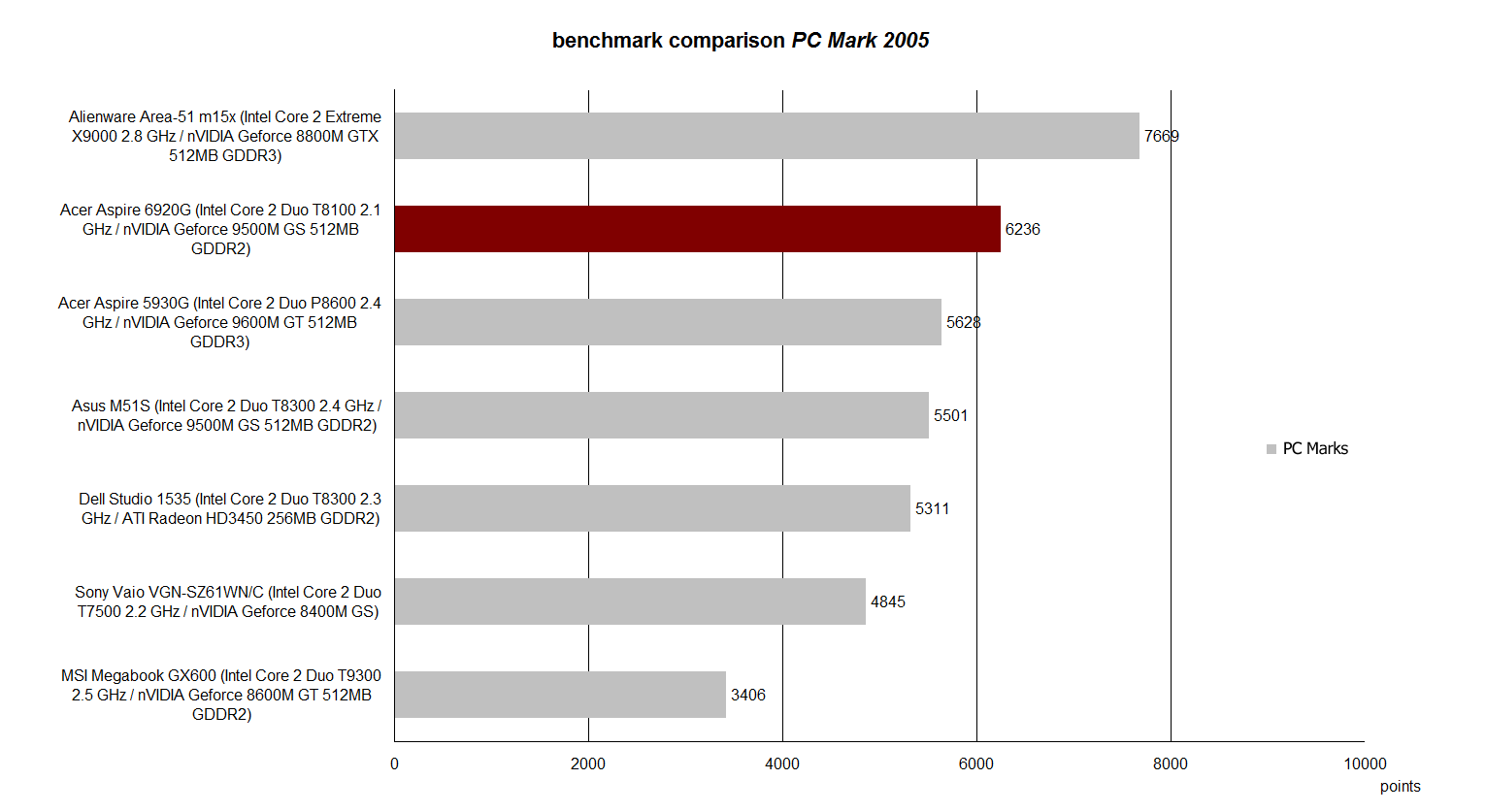 Das Resultat des Gespanns kann sich sehen lassen, wie man anhand der folgenden Benchmarks erkennen kann. Standardanwendungen wie das Surfen im Internet, Emails schreiben, Office Applikationen, Musik hören oder einen Film auf dem Notebook anschauen stellen für die heutigen portablen Rechenknechte kaum eine Herausforderungen mehr dar und gehören mittlerweile zu deren Standardrepertoire. Wer darüber hinaus noch das eine oder andere Spiel spielen will, dem bietet das Aspire 5930G noch genug Leistung um auch diese genießen zu können, aber mehr dazu im nächsten Kapitel.
