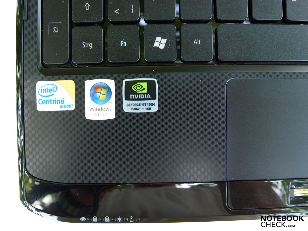 Die Tastatur zeigt erfreulicherweise ein Standardlayout. Der im Aspire 5536G vorhandene separate Nummernblock wurde eingespart. Dass dennoch die Standardtastatur etwas linkslastig angeordnet ist, liegt an den für die Multimediasteuerelemente rechts neben der Tastatur benötigten Platz. Wie beim Aspire 5536G wurden die alphanumerischen Tasten geringfügig auf 17 Millimeter Breite und 17 Millimeter Tiefe verkleinert. Diesmal allerdings zugunsten des für die Multimediakonsole benötigten Platzes. Ziemlich schmal sind die Pfeiltasten geraten und auch die F-Tasten mussten etwas an Höhe einbüßen.