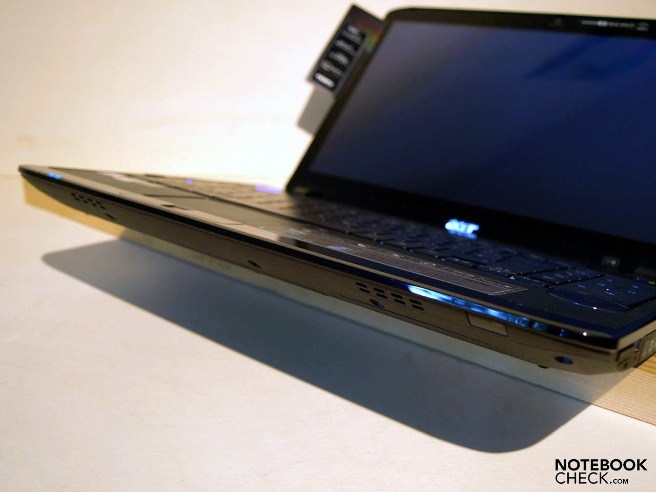 Ganz in Schwarz präsentiert sich das 5935G. Ausschließlich? Nein, einzelne Elemente wurden in einem dunklen Saphirblau ausgeführt, beispielsweise ist der runde Lautstärkdrehregler blau umrandet und auch der Subwoofer an der Rückseite ist mit blauen Elementen verziert. Einmal an der Steckdose angeschlossen ist, springt außerdem die blaue Visualisierung des Einschaltknopf ins Auge. Eigentlich sollte in diesem Zustand nur der waagrechte Strich, symbolisch für das Kabel, beleuchtet sein, doch auch der Kreis um den Einschaltknopf leuchtet etwas mit. Hat man ihn schon gedrückt? Nein, nach Einschalten wird der Kreis deutlicher und greller sichtbar und auch die Tastatur erstrahlt von weißen LEDs unterhalb jeder Taste beleuchtet. Die weiß, blaue LED Beleuchtung wird auch mit Ausnahme der Wireless-LAN Taste/Kontrollleuchte, welcher orange zugeordnet wurde, und der Acer Power-Smart-Taste (grün) rechts oberhalb der Tastatur, einheitlich durchgezogen.