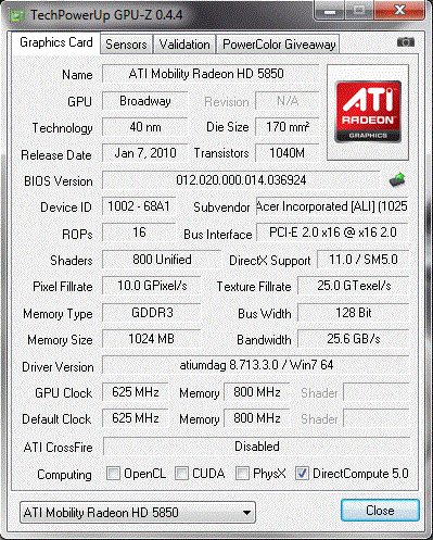Bei der Grafikkarte hat Acer zur Mobility Radeon HD 5850 von ATI gegriffen. Die DirectX 11 fähige und in 40nm Strukturbreite gefertigte GPU kann mit 1040 Millionen Transistoren, 800 Unified Shadern, einem Kerntakt von 625 MHz sowie einem Speichertakt von 800 MHz aufwarten. Der 1024 MByte große Videospeicher ist derweil nur mit 128bit angebunden, was theoretisch kein Problem wäre, wenn Acer auf GDDR5-VRAM gesetzt hätte. Die vorliegende Kombination aus DDR3-VRAM und 128bit Speicherinterface schränkt die Leistung gerade in höheren Auflösungen deutlich ein. Aufgrund dessen ordnet sich die Radeon HD 5850 des Aspire 5943G nicht im HighEnd-Segment, sondern eher in der oberen Mittelklasse ein. Der Stromverbrauch geht mit 30-39 Watt angesichts der gebotenen Leistung indes noch in Ordnung.