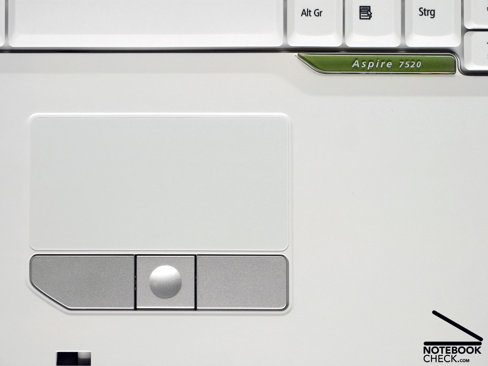 Neben einer angenehm groß geratenen zweizeiligen Enter-Taste integriert unser 7520G ein sofort intuitiv bedienbares deutsches Desktop-Tasten-Layout. Haptisch ist der Anschlag der Haupttasten wohl Geschmackssache, insgesamt hinterlässt das Eingabebrett des Aspire 7520G aber einen ganz angenehmen Eindruck. Die Tasten haben einen vergleichsweise festen Druckpunkt und erlauben im Test auch bei längeren Texten kommodes Tippen.