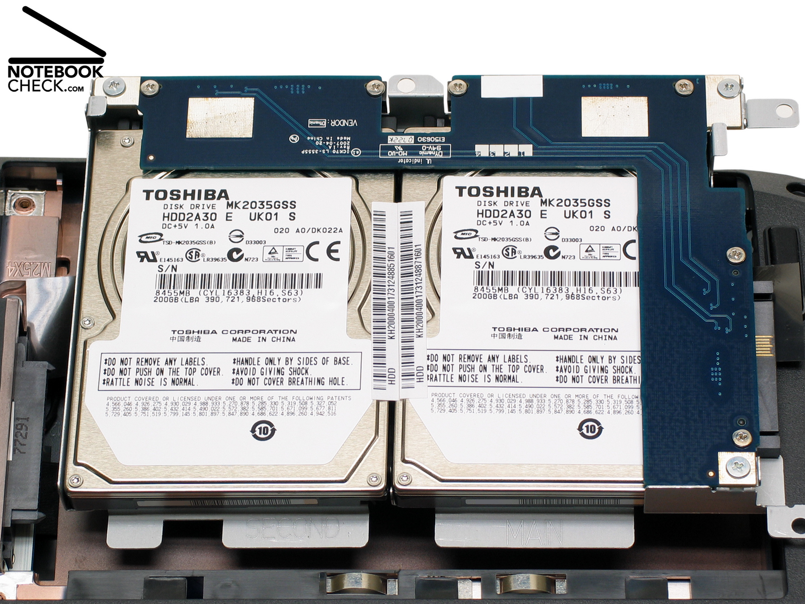 Bei der Festplattenkapazität präsentiert sich das Aspire 7520G mit knapp 400 GByte Gesamtspeichervolumen als wahres Speichermonster. Gleich zwei (!) SATA-Festplatten vom Typ MK2035GSS (Toshiba) bieten Speicherplatz satt. Allerdings drehen sich die Platten der MK2035GSS mit 4.200 U/min recht langsam. So ist es wenig verwunderlich, dass die HDDs beim Festplattentest HDTune „nur“ eine schwache Datentransferrate von 30,5 MB/s erreichen. Das erklärt zudem auch das recht zähe Arbeiten des 7520G beim Starten von umfangreichen Applikationen und beim Transfer großer Datenvolumen auf die Platten. Unsere mit 7.200 U/min rotierende ST910021A von Seagate liefert hier eine knapp 20 Prozent höhere durchschnittliche Transferrate (38,0 MB/s).