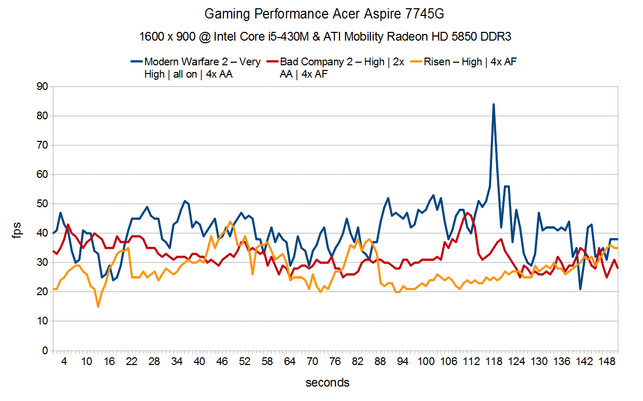 In Bad Company 2 kommt das Aspire 7745G schon mehr ins Schwitzen. Mit hohen Details, 2x AA und 4x AF sieht man sich aufgrund von 32.3 fps einem recht ruckeligen Spielerlebnis konfrontiert. Deaktiviert man Antialiasing und greift auf zweifache anisotrope Filterung zurück, steigt die Performance auf gute 41.3 fps.