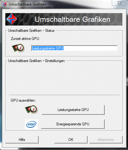 Lob verdient Acer dagegen für die Option zum Umschalten zwischen dedizierter und integrierter Grafikeinheit (Switchable Graphics). Diese Technik findet sich erfreulicherweise in immer mehr Notebooks (z.B. Acer Aspire 4820TG) und ist äußerst praktisch, da der Nutzer so je nach Anwendungsszenario den Fokus eher auf Leistung oder eher auf Mobilität legen kann. Der Vorgang zur Umschaltung geht indes denkbar einfach von statten (Rechtsklick auf den Desktop, Umschaltbare Grafiken konfigurieren) und nimmt nur ein paar Sekunden in Anspruch. Voraussetzung ist aber, dass vorher bestimmte Programme geschlossen sind.