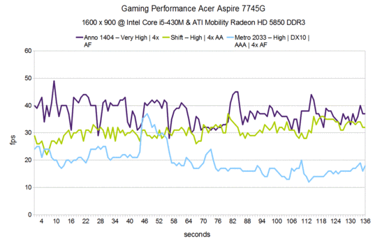 Das Aufbaustrategiespiel profitiert zugegebenermaßen stark von Vierkern-CPUs, trotzdem kann das Aspire 7745G Anno 1404 selbst mit sehr hohen Details und 4x AF noch ausreichend befeuern, 37.4 fps sei dank. Zwar schwankte die Bildwiederholrate je nach Zoomstufe merklich, in den unspielbaren Bereich sackte Anno 1404 jedoch nie ab.