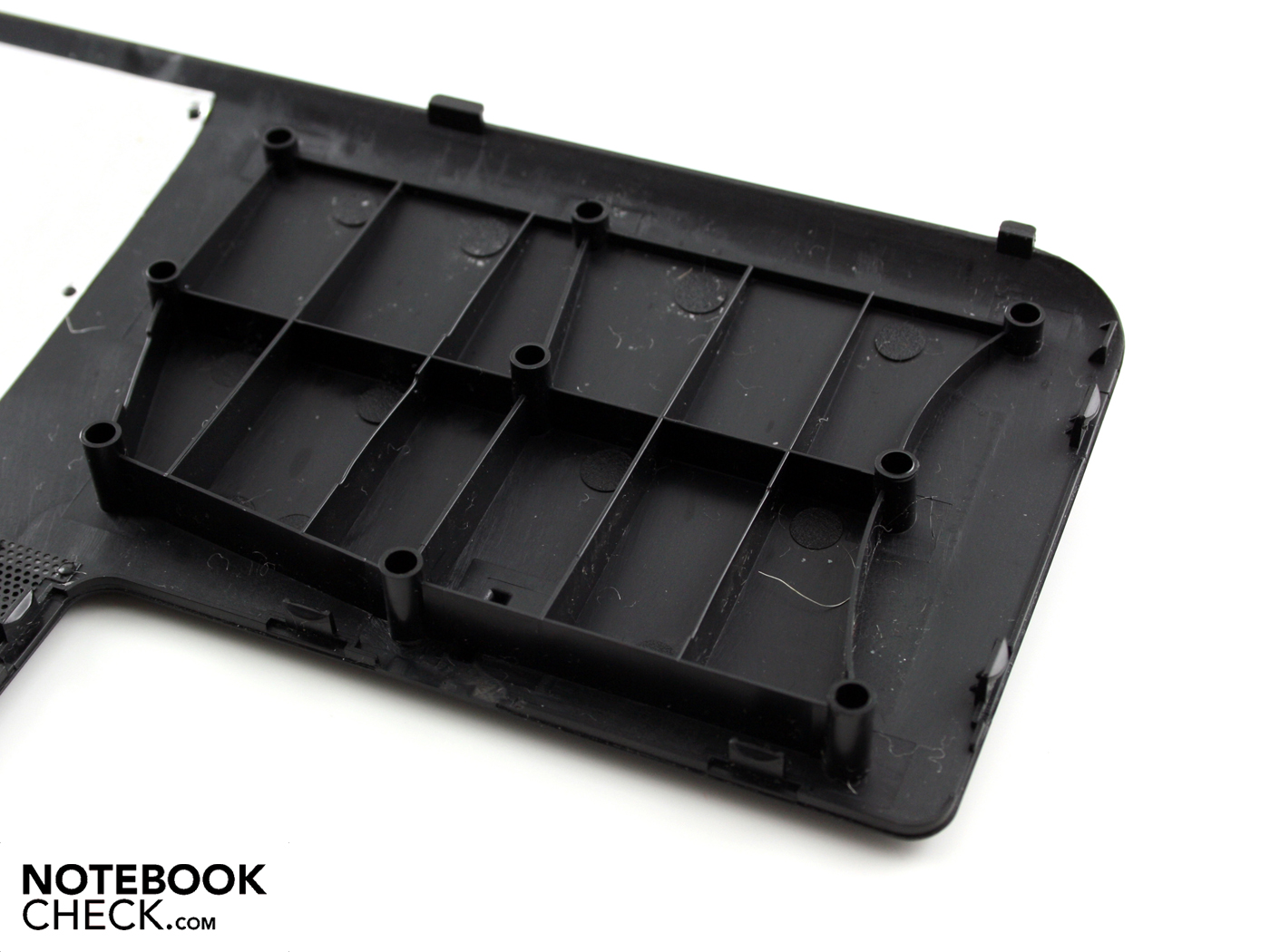 Das relativ dünne Gehäuse ist angemessen stabil, wenn auch nicht perfekt. Gefallen finden wir am nicht eindrückbaren Bereich über und unter dem Blu-ray Laufwerk. Mit beiden Händen anfassend, können wir das Chassis dennoch ein stückweit verbiegen. Die Handballenauflage kann rechts auf Höhe des Konfigurationsaufklebers mit etwas Kraft eingedrückt werden.