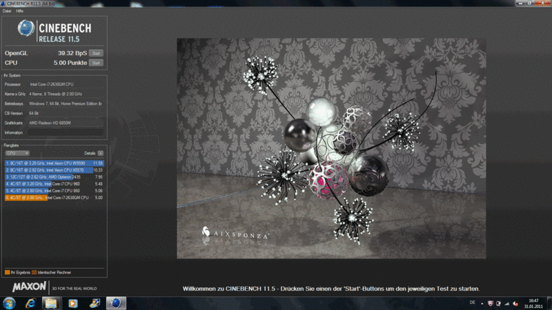 Der Cinebench R11.5 CPU-Test (Multi, 64 Bit) geht mit 5.0 Punkten richtig zur Sache. Das ist deutlich mehr als ein 740QM (3.4; MSI GX660R). Nur ein 2820QM (5.7) kann hier noch etwas drauflegen (mySN XMG P501).