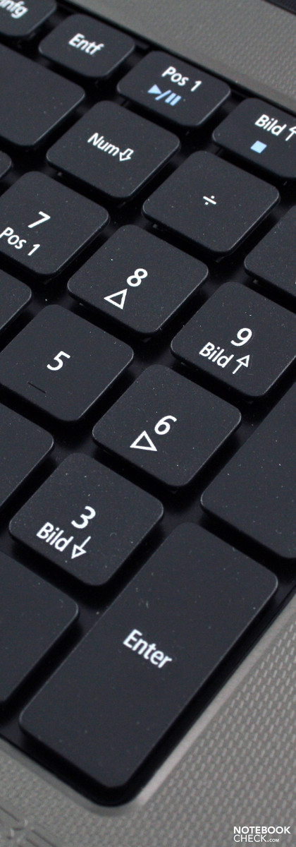 Der integrierte Ziffernblock ist ein Vorteil für die Eingabe von Zahlenkolonnen. Angenehm ist, dass es sich um einen ausgewachsenen Ziffernblock ohne verkleinerte bzw. weggelassene Tasten handelt. Die Richtungstasten sind nur halb so groß wie normale Buchstabentasten, denn sie durften nicht in den Bereich der Handauflage ausbrechen. Ein kleiner Zwischenraum sorgt aber immerhin für ein gutes Ertasten.